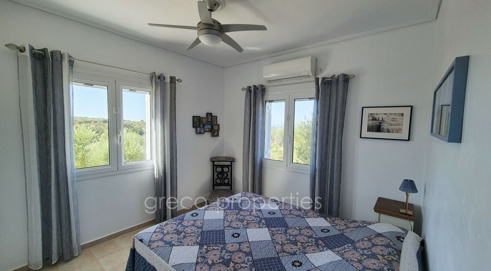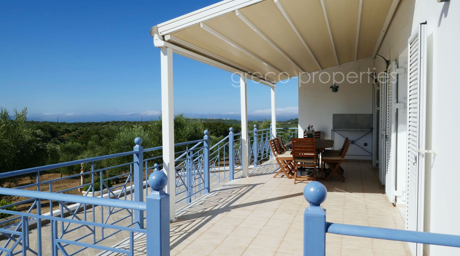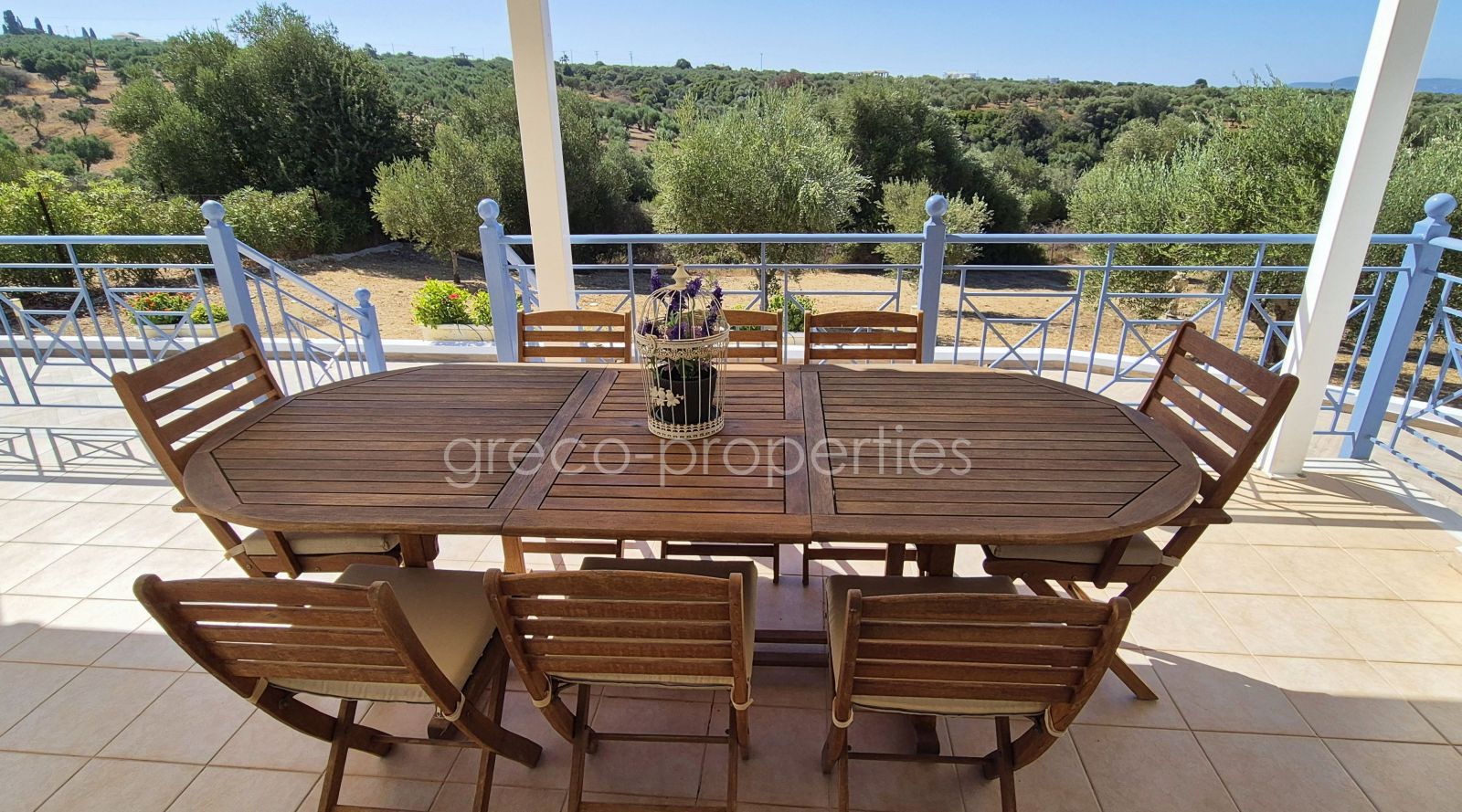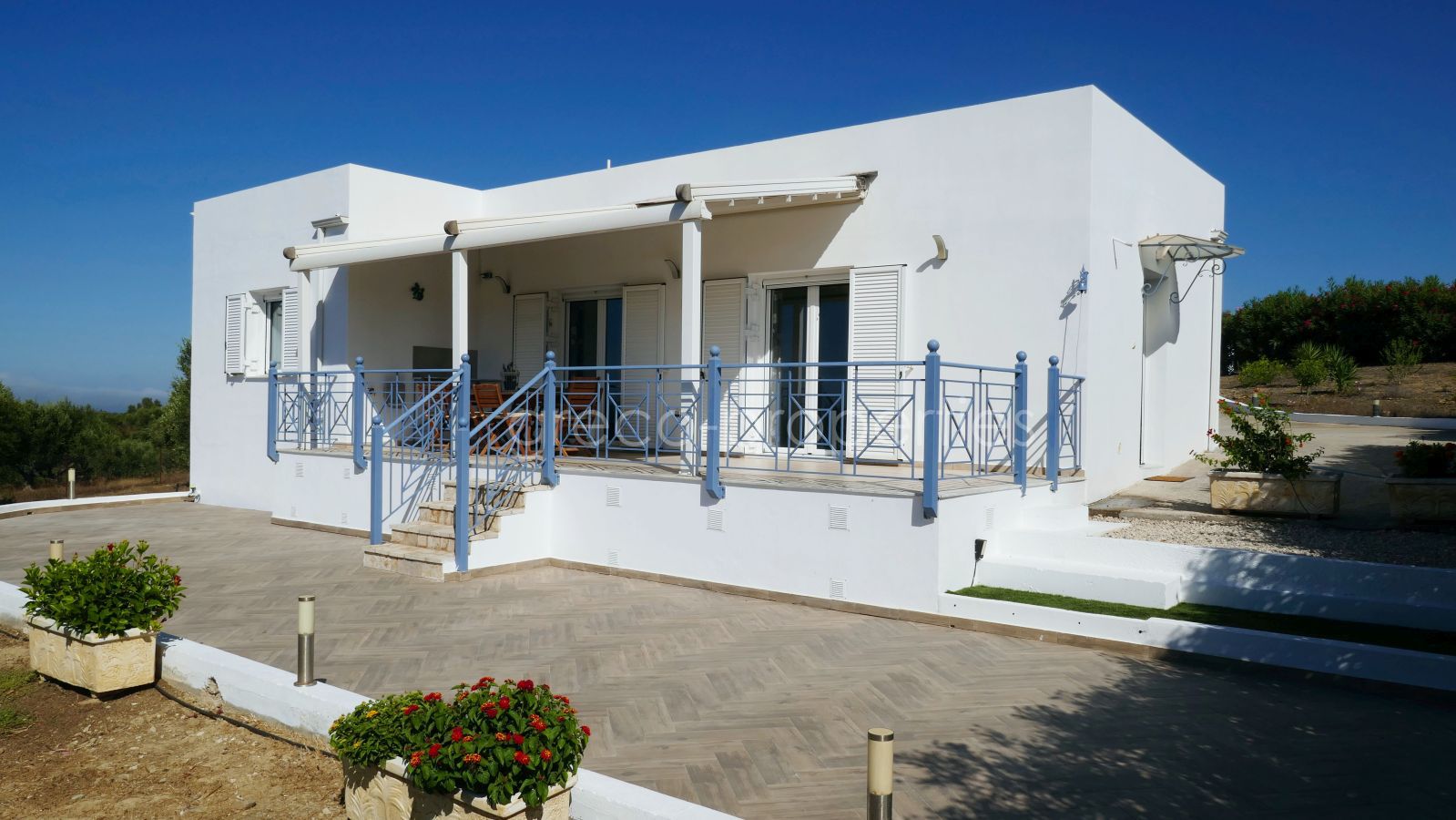 Ein strahlend weißes Inselhaus im typischen griechischen Stil – klar, elegant und harmonisch eingebettet in einem Meer von Ölbäumen. Das flache Dach und die kubische Architektur erinnern an die Tradition der Kykladeninseln, während die moderne, stilvolle Einrichtung höchsten Wohnkomfort bietet. Weiß getünchte Wände, klare Linien und stilvolle Details schaffen eine ruhige, ansprechende Atmosphäre – perfekt für Ihr Domizil in Messenien! Von der großzügigen Terrasse genießen Sie den unverbaubaren Blick über die flache Hügellandschaft auf das Ionische Meer mit seinen vorgelagerten Inselwelt. Eine weitere Terrasse auf Gartenebene schafft den Übergang in den umgebenden Olivenhain.