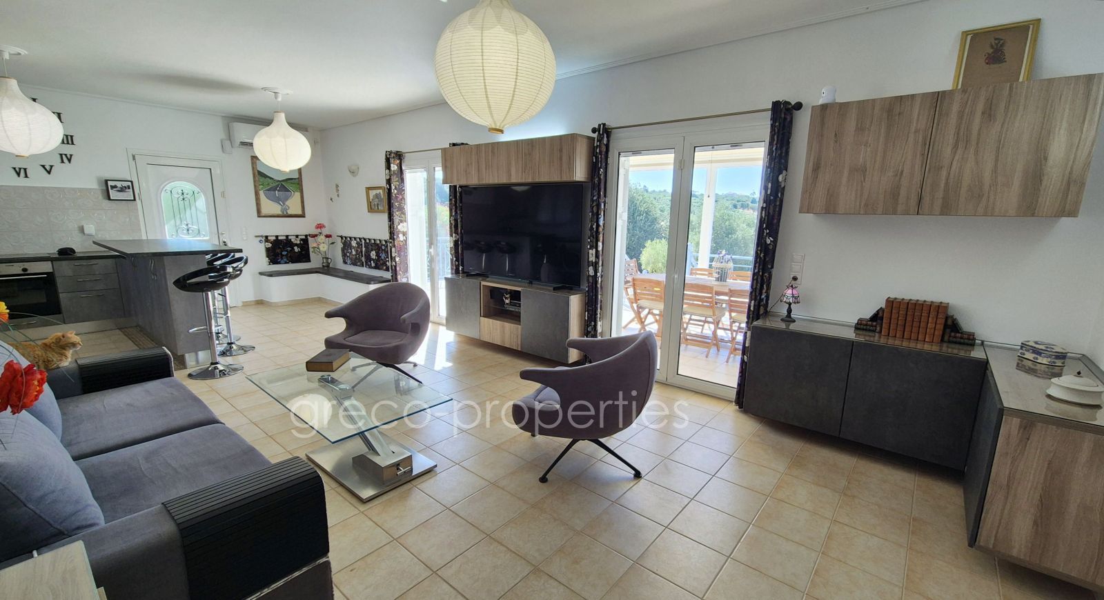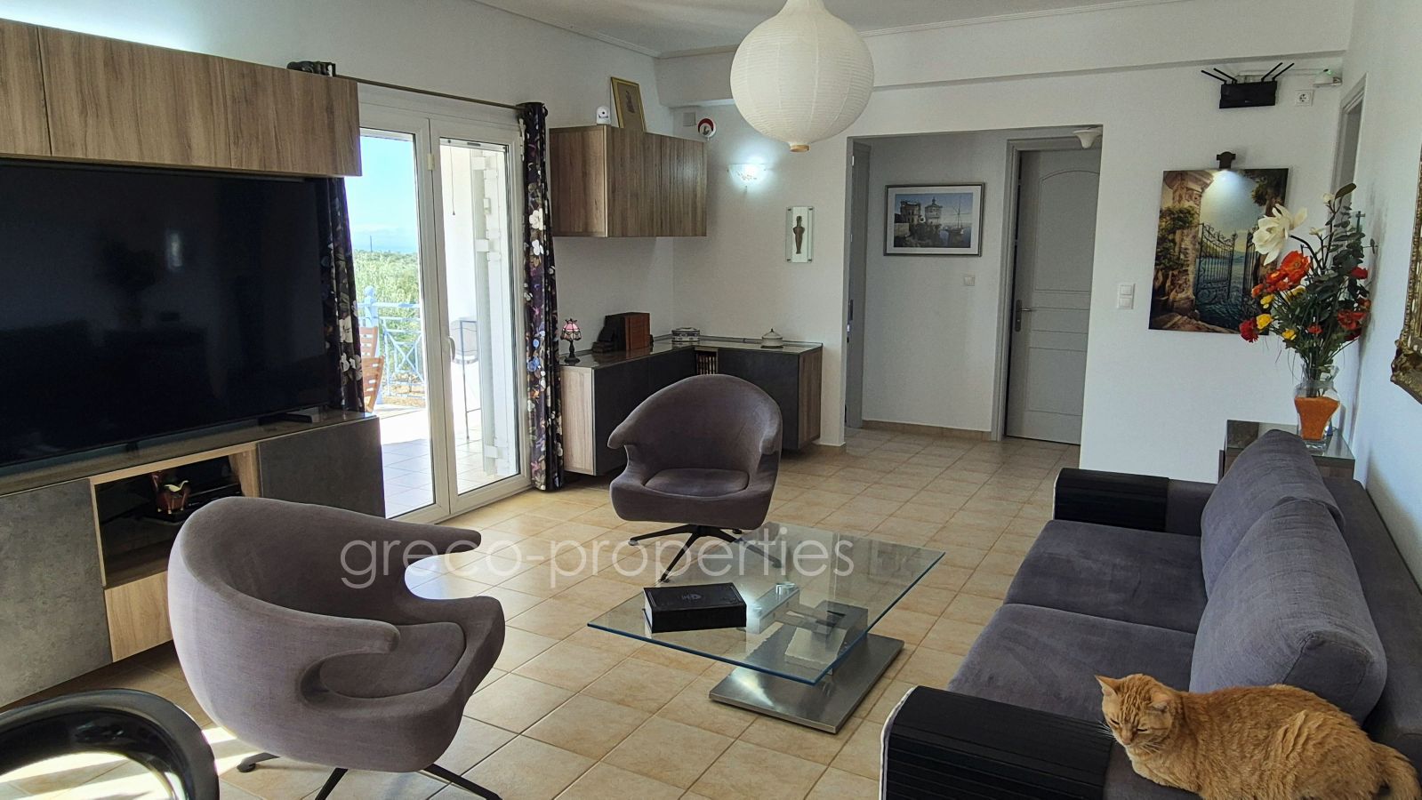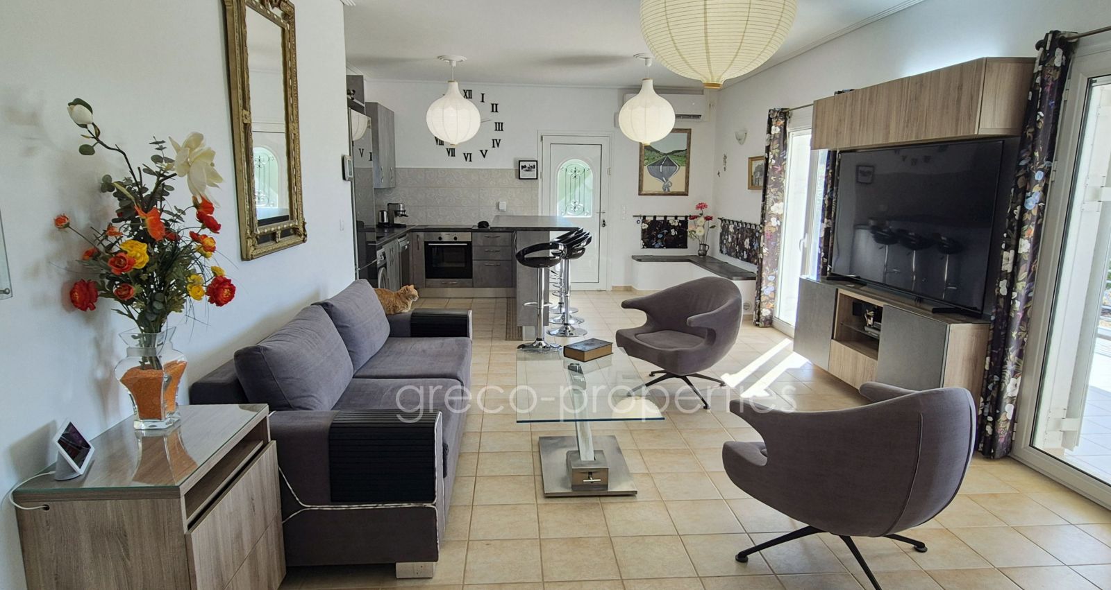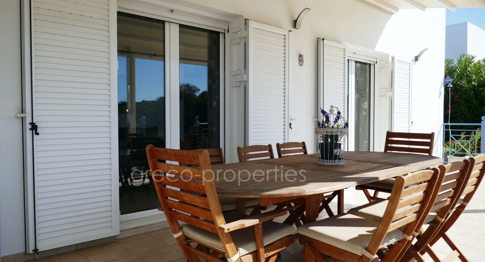 Ein strahlend weißes Inselhaus im typischen griechischen Stil – klar, elegant und harmonisch eingebettet in einem Meer von Ölbäumen. Das flache Dach und die kubische Architektur erinnern an die Tradition der Kykladeninseln, während die moderne, stilvolle Einrichtung höchsten Wohnkomfort bietet. Weiß getünchte Wände, klare Linien und stilvolle Details schaffen eine ruhige, ansprechende Atmosphäre – perfekt für Ihr Domizil in Messenien! Von der großzügigen Terrasse genießen Sie den unverbaubaren Blick über die flache Hügellandschaft auf das Ionische Meer mit seinen vorgelagerten Inselwelt. Eine weitere Terrasse auf Gartenebene schafft den Übergang in den umgebenden Olivenhain.