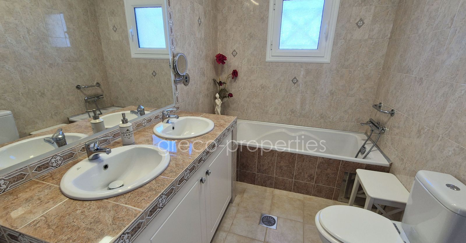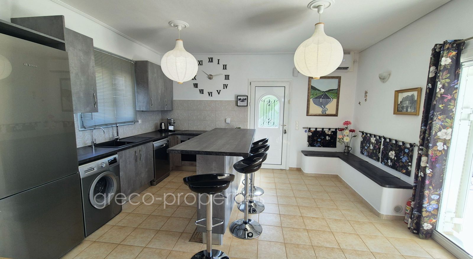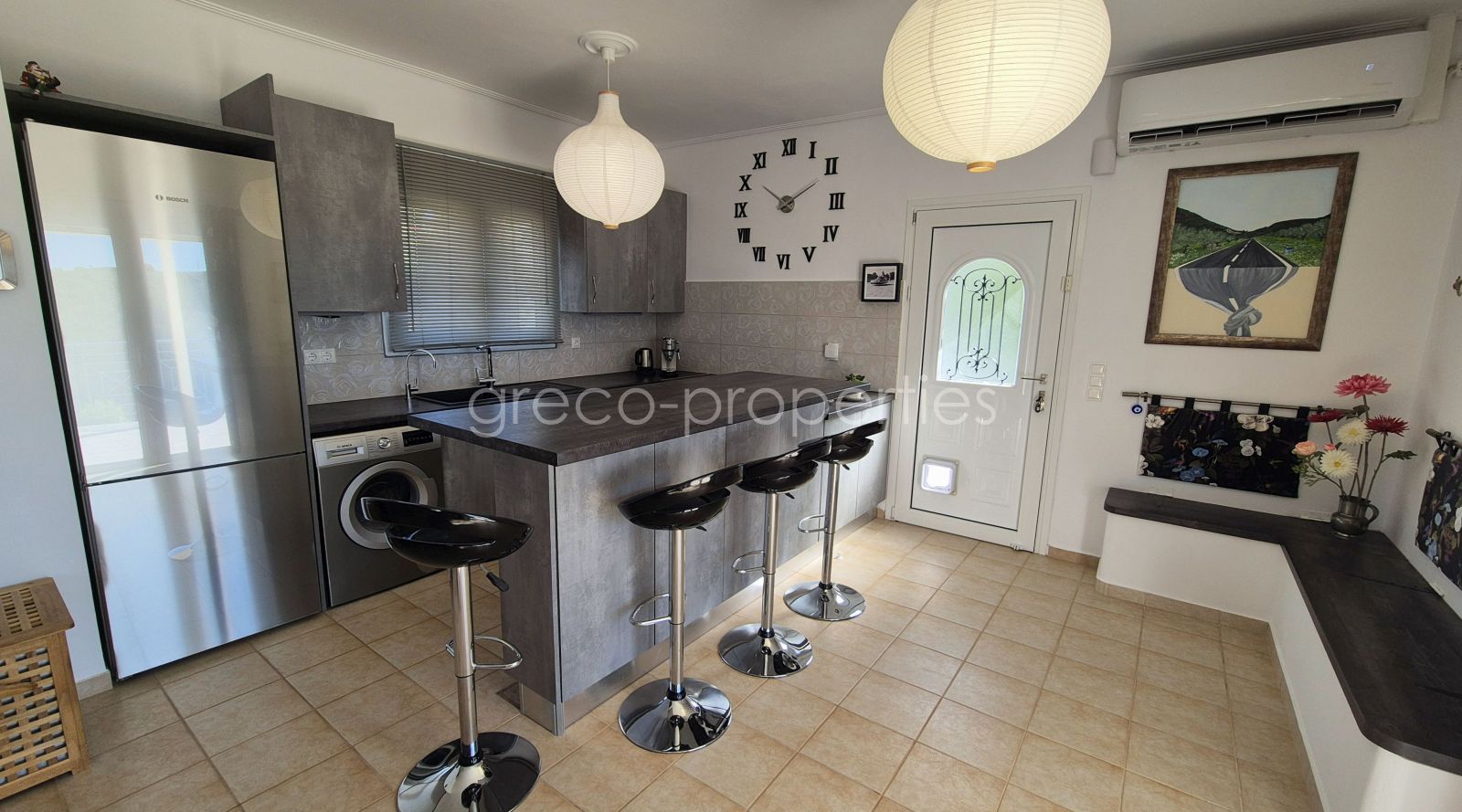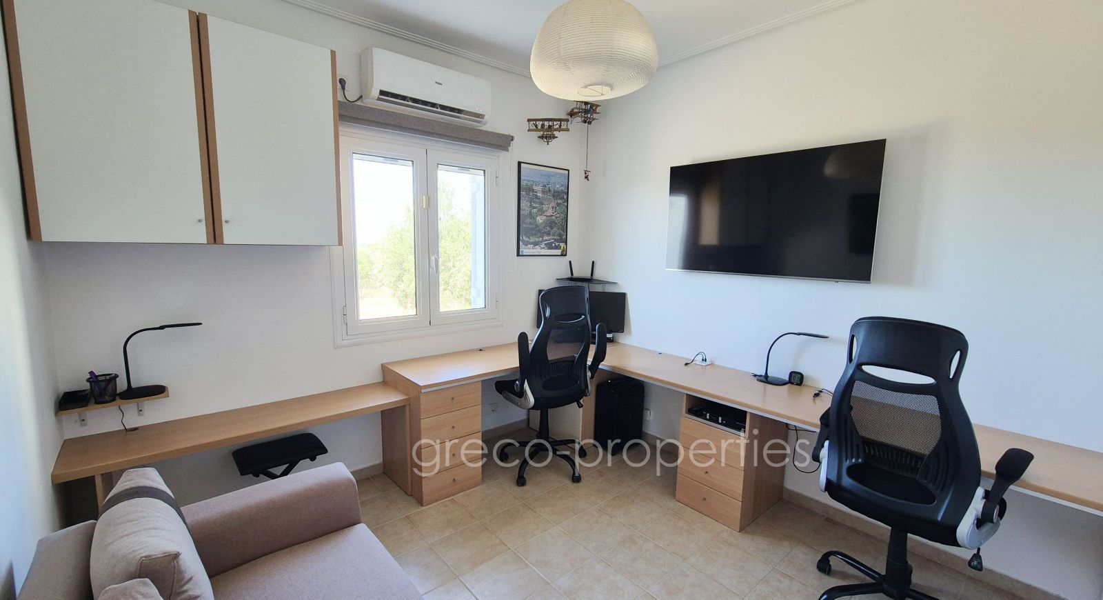 Ein strahlend weißes Inselhaus im typischen griechischen Stil – klar, elegant und harmonisch eingebettet in einem Meer von Ölbäumen. Das flache Dach und die kubische Architektur erinnern an die Tradition der Kykladeninseln, während die moderne, stilvolle Einrichtung höchsten Wohnkomfort bietet. Weiß getünchte Wände, klare Linien und stilvolle Details schaffen eine ruhige, ansprechende Atmosphäre – perfekt für Ihr Domizil in Messenien! Von der großzügigen Terrasse genießen Sie den unverbaubaren Blick über die flache Hügellandschaft auf das Ionische Meer mit seinen vorgelagerten Inselwelt. Eine weitere Terrasse auf Gartenebene schafft den Übergang in den umgebenden Olivenhain.