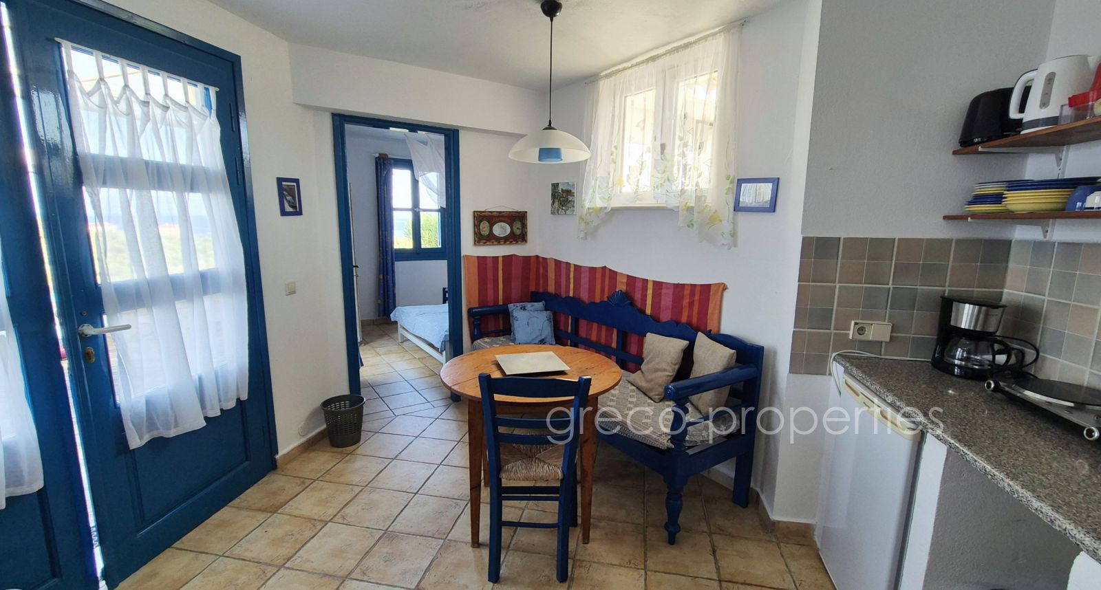 Die Fahrtzeit vom Internationalen Flughafen Kalamata beträgt nur 30 Minuten, der nächste Supermarkt ist nur 1.200m entfernt, alle weiteren Dinge des täglichen Bedarfs erhalten Sie im nahegelegenen Städtchen Petalidi (7km/ 10 Fahrminuten).