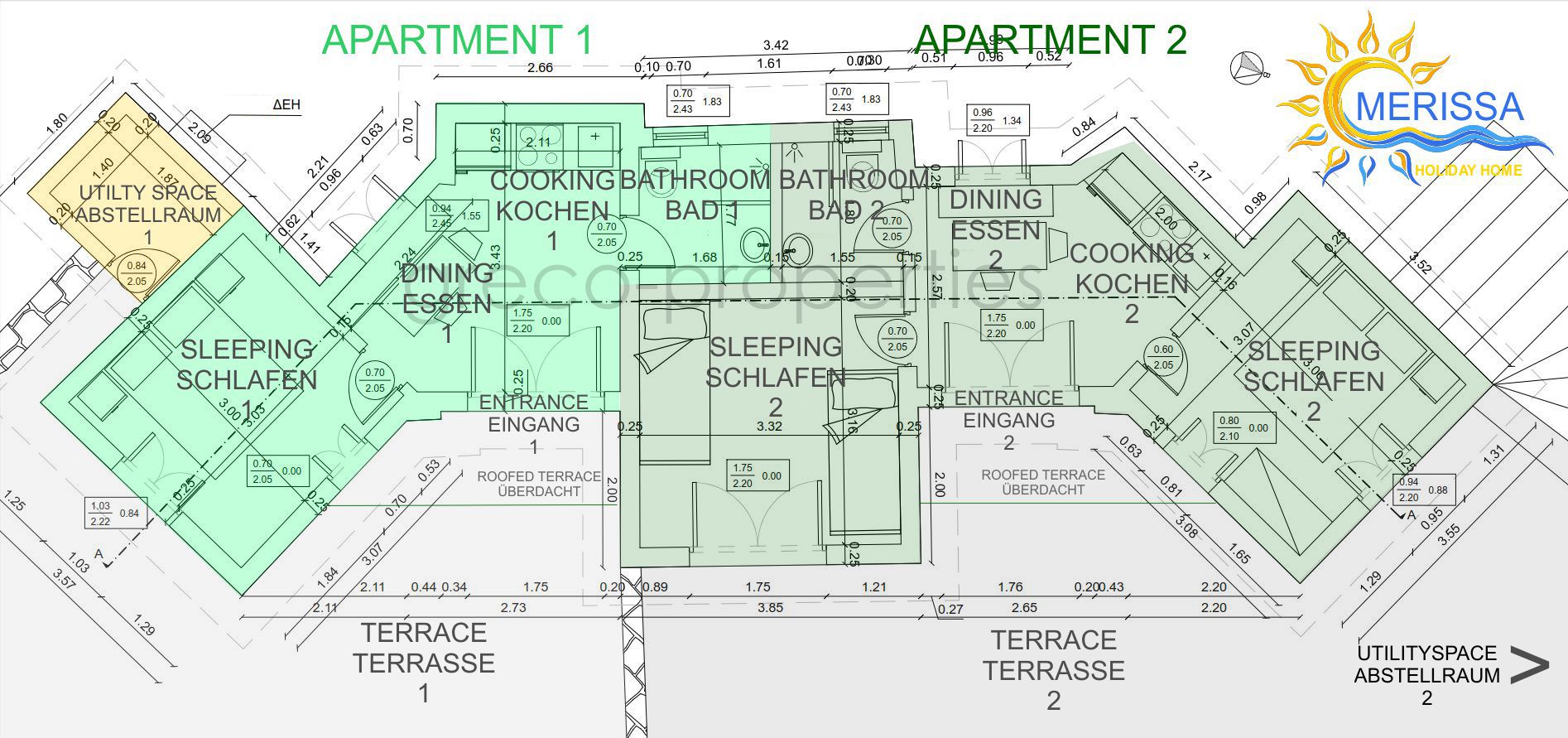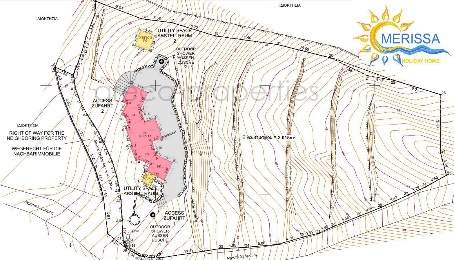 Drei Schlafzimmer verteilen sich auf zwei Apartments, jedes hat seine kleine Küche und jeweils ein Bad. Die mediterrane Philosophie des “Wohnens im Freien” wird hier geradewegs umgesetzt: ein kleiner Platz für den Tisch drinnen, aber großzügige Terrassen draußen, umgeben von gut 2.000qm, bereit für Landschaftsarchitektur, die dem mediterranem Umfeld und Zeitgeist mit klimakonformer Bepflanzung gerecht wird. Unsere Gärtnerfirma “Plant & Earth” steht bereit.