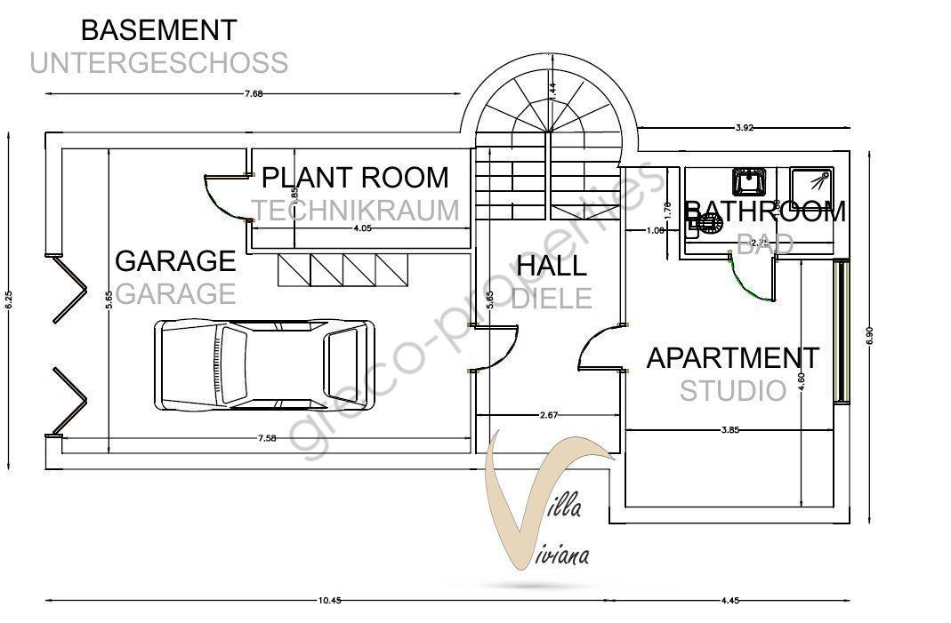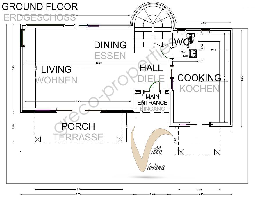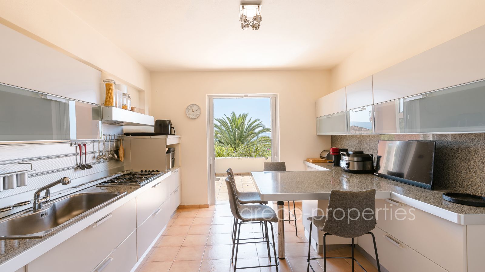 Die moderne Architektur der VILLA VIVIANA zeichnet sich durch schlichte, gerade Linien aus. Die klar strukturierte Fassade ist in Erdtönen gehalten, wodurch sich das Anwesen harmonisch in das mediterrane Landschaftsbild einfügt. Die gerade Linienführung setzt sich im Interieur fort, alle Räume sind funktional und äußerst großzügig gestaltet. Eine Sofalandschaft samt passender Sessel setzt das geräumige Wohnzimmer (43m²) in Szene, der traumhafte Meerblick entfaltet seine ganze Wirkung durch die großen Glasschiebetüren. Wohnen und Dinieren gehen nahtlos ineinander über und bilden durch eine lange Holztafel das kommunikative Zentrum des Hauses, gut geeignet für gesellige Runden. Über die offen gestaltete Diele betritt man die über 20m² große, separate Küche. Die modern designte Wohnküche ist mit den neuesten Geräten ausgestattet und bietet einen Tresen als zusätzlichen Essplatz mit 4 Barhockern sowie viel Stauraum. Auch das kleine Gäste-WC wird durch sein dekorative Einrichtung ästhetischen Ansprüchen gerecht. Eine halbgewendelte Innentreppe verbindet jeweils eine Diele im Ober- wie auch Untergeschoss.