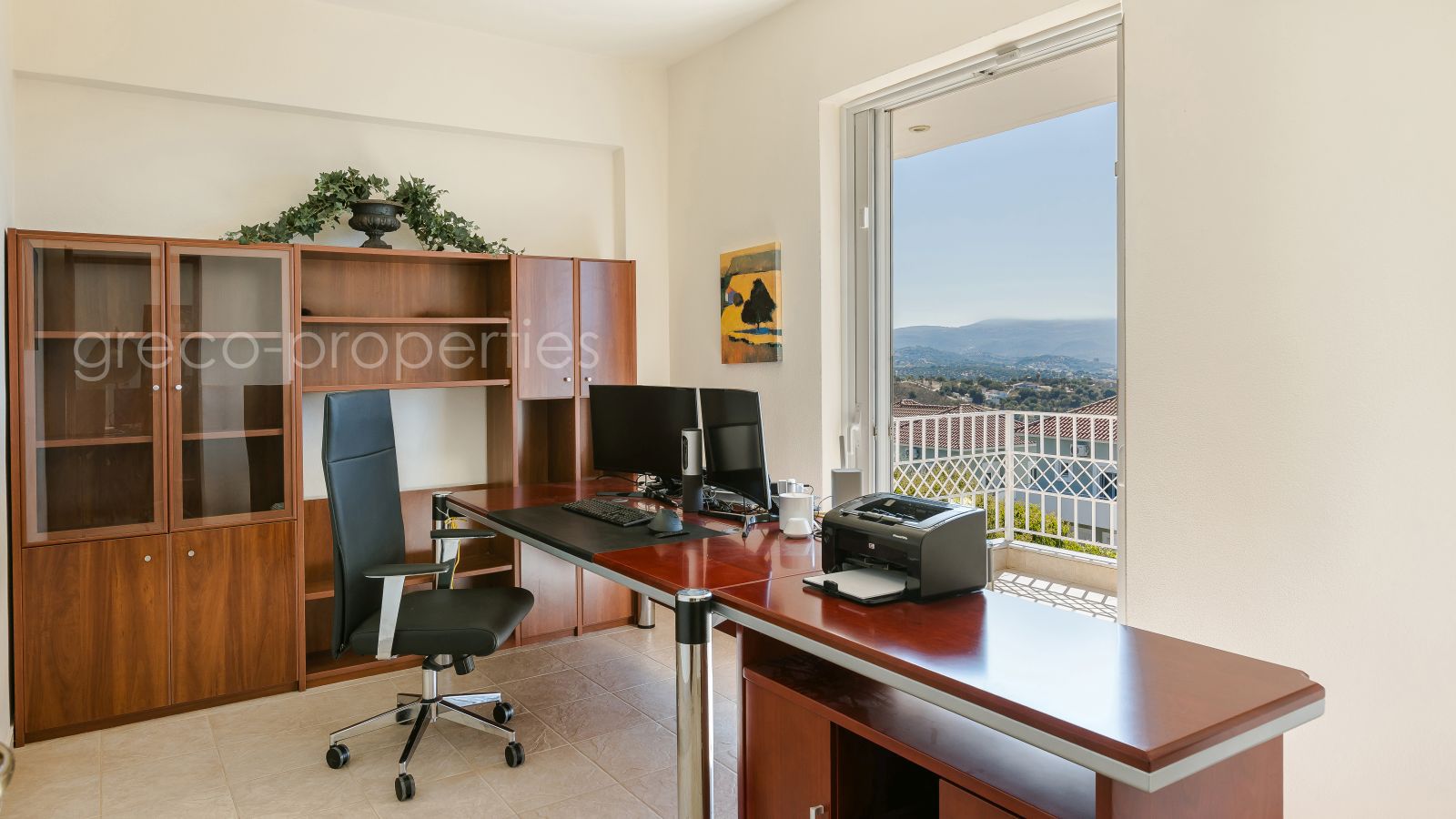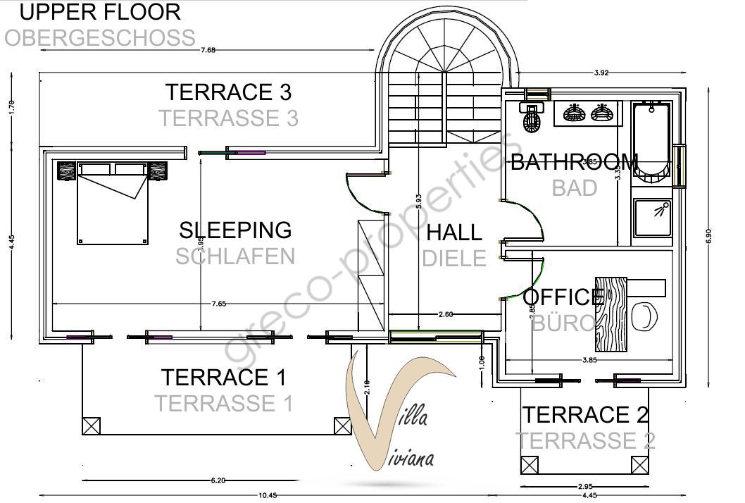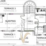 Das Glasdach über dem lichtdurchfluteten Vorraum des Obergeschosses verleiht einen herrschaftlichen Eindruck. Das Hauptschlafzimmer ist mit einer Fläche von ca. 43m² feudal geschnitten und bietet so ausreichend Rückzugsmöglichkeit zur ungestörten und freien Entfaltung. Zwei Balkone mit je 13m² lassen Sommernächte draußen genießen, sowie auch kreativen Ideen freien Lauf: Schlafen unter mediterranen Sternen, mit Blick auf den im Mondlicht schimmernden Meeresspiegel? Als besonderes Highlight verfügt das Obergeschoss über ein großes Badezimmer (13m²) mit Doppelwaschbecken, einer gemauerten Badewanne und Dusche sowie einem Dusch-WC, und als weiteren Raum ein Arbeitszimmer (10m²) mit Balkon, das alternativ als weiteres Schlafzimmer dienen kann.