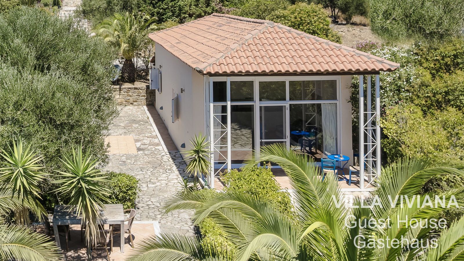 Eine Besonderheit des Anwesens gilt das eigenständige Gästehaus mit Terrasse, die – versteckt zwischen Olivenbäumen und Palmen – die private Atmosphäre seiner Bewohner respektiert. Die nahezu überdimensionale Fensterfront und eine hohe Decke sorgen für ein luftiges Raumgefühl und verleihen dem Wohnbereich mit seiner Küchenzeile und dem Eßtisch eine offene Großzügigkeit. Diese Festtstellung gilt auch für das Schlafzimmer, das durch eine offene Mansarde mit Wendeltreppe zusätzliche Schlafkapazitäten anbietet. Ein Badezimmer ergänzt das Angebot an die Gäste.