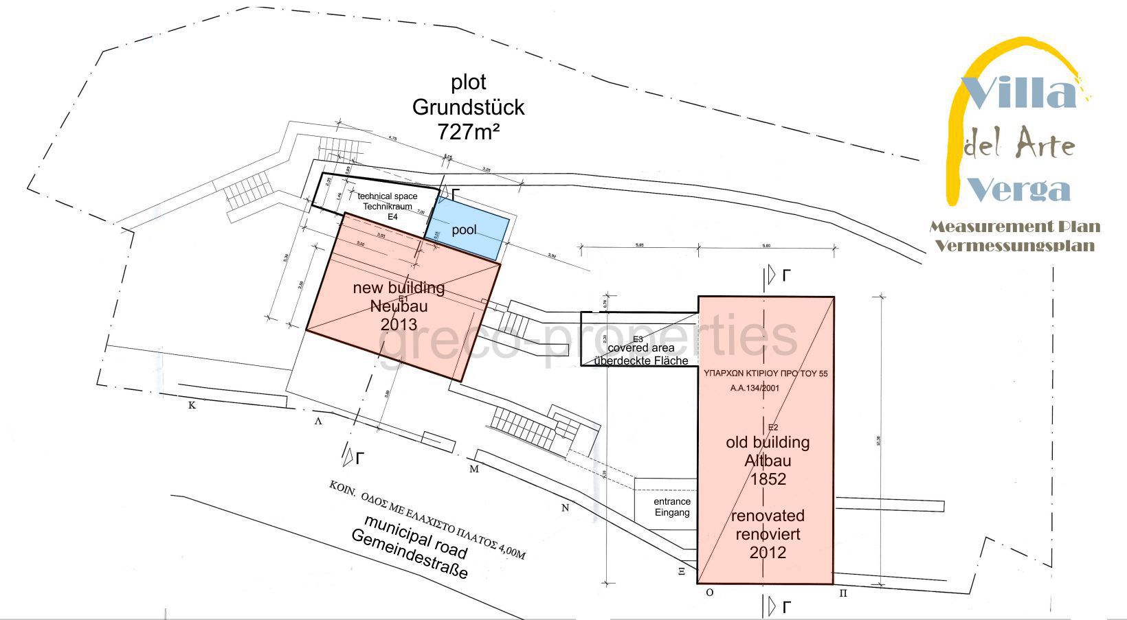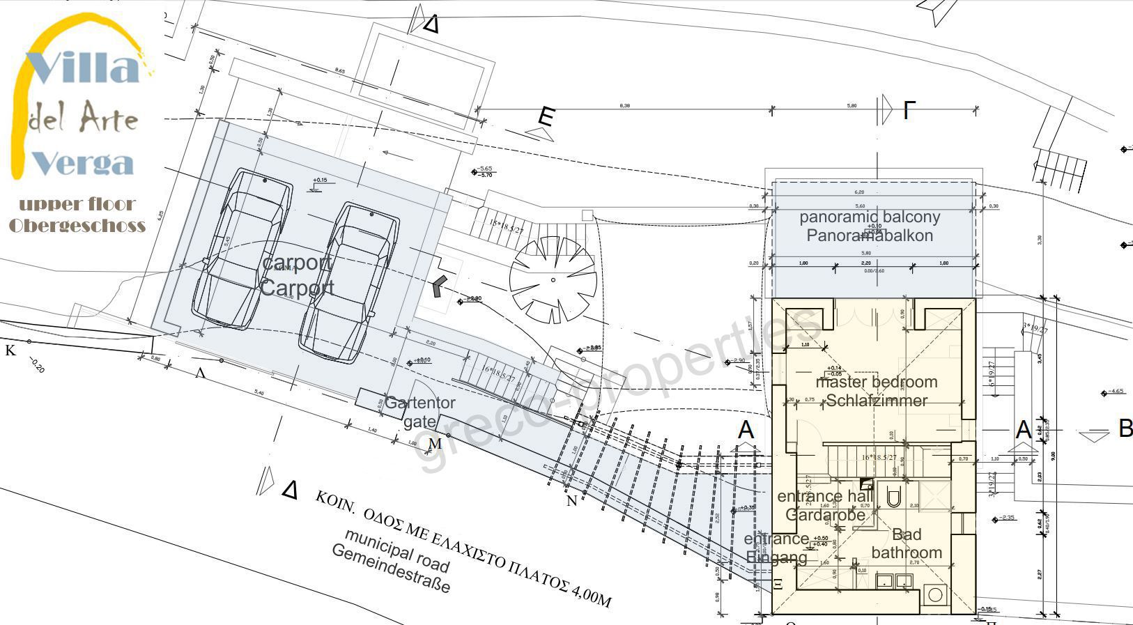 Eine 2m hohe Natursteinmauer schirmt das Anwesen auf seiner Rückseite gegen die kaum befahrende Gemeindestraße ab. Der Carport oberhalb des Neubaus bietet zwei Stellplätze, daneben befindet sich ein separates Gartentor, durch das Sie zum Eingang des Altbaus auf der obersten Ebene gelangen. Von der Garderobe der Eingangsdiele führt eine Holztreppe in den darunter liegenden Wohnbereich. Im oberen Geschoss befindet sich das „Master-Bedroom“, von dessen Terrasse Sie einen atemberaubenden Blick auf die messenische Bucht und die Provinzhauptstadt Kalamata genießen. Neben dem Eingang befindet sich ein geräumiges Bad.
