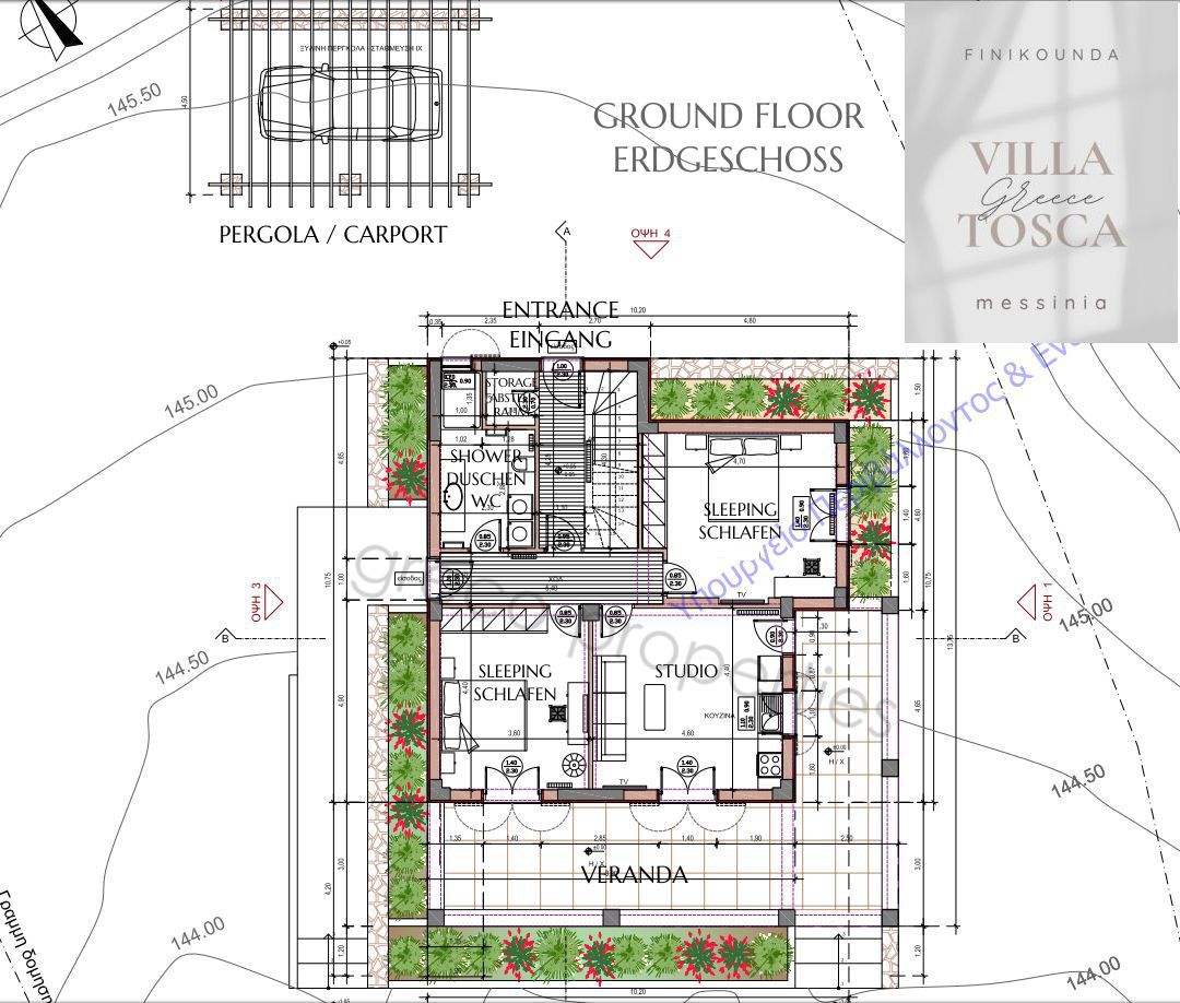 Im Erdgeschoss befinden sich zwei Schlafzimmer, ein Studio (Schlafzimmer mit Sitzecke und Kitchenette), ein geräumiges Duschbad sowie ein Garderoben- als auch Abstellraum. Eine überdachte Veranda schafft die Verbindung von allen Zimmern zum weitläufigen Poolbereich.