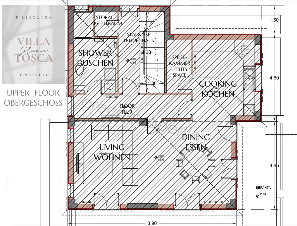 Im Obergeschoss besticht ein geräumiger Wohn-/Essbereich mit offenem Dachgebälk als soziales Herzstück des Hauses. Die anspruchsvolle Küche mit hochwertigen Mobiliar ist als eigener Raum gleichfalls ein Ort des Zusammentreffens, die angrenzende Speisekammer sorgt für Funktionalität. Die unterschiedlichen, warmen Pastellfarben der Wände und natürliche Materialien der Möbel schaffen in allen Räumen Gemütlichkeit und optimales Wohlfühlklima. Ein weiteres, großzügiges Bad mit WC und Waschmaschinenanschluss ermöglicht eventuell gewünschte Funktionsänderungen bestimmter Räume. Ein zweiter Abstellraum ist für hauswirtschaftliche Nutzung vorgesehen. Vom Wohnbereich und der großen, überdachten Terrasse kann man eine atemberaubende Sicht genießen – der freie, unverbaubare Blick schweift über den Garten auf das Grün der Olivenhainlandschaft und das Blau des Ionischen Meeres.