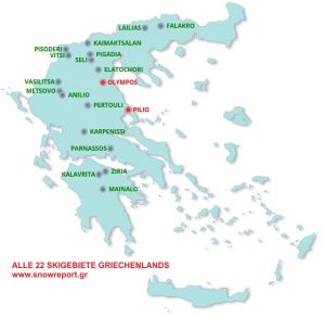 Logischerweise liegen die meisten Skigebiete im Norden Griechenlands. Das Größte liegt in Mittelgriechenland am Parnassgebirge oberhalb des antiken Orakels von Delphi. Unser Skizentrum am Chelmos ist landesweit das Sechstgrößte, das südlichste jedenfalls befindet sich im Mainalongebirge auf dem Peloponnes, dem “Hausberg” hinter Tripolis. Sie benötigen von der Autobahnausfahrt Tripolis-Athen gerade einmal 15 Fahrminuten. Es gibt dort 3 Teller-Schlepplifte von 1.550m bis 1.860m, für die südliche Lage und niedrige Höhe etwas schneeunsicher, das Pistenangebot ist für Anfänger geeignet. Das Mini-Skigebiet Mainalon hat allerdings einen erwähnenswerten Superlativ: es ist das zweitsüdlichste Skigebiet Europas! Nur die Bergbahnen der Sierra Nevada in Spanien liegen gerade mal 60km südlicher…